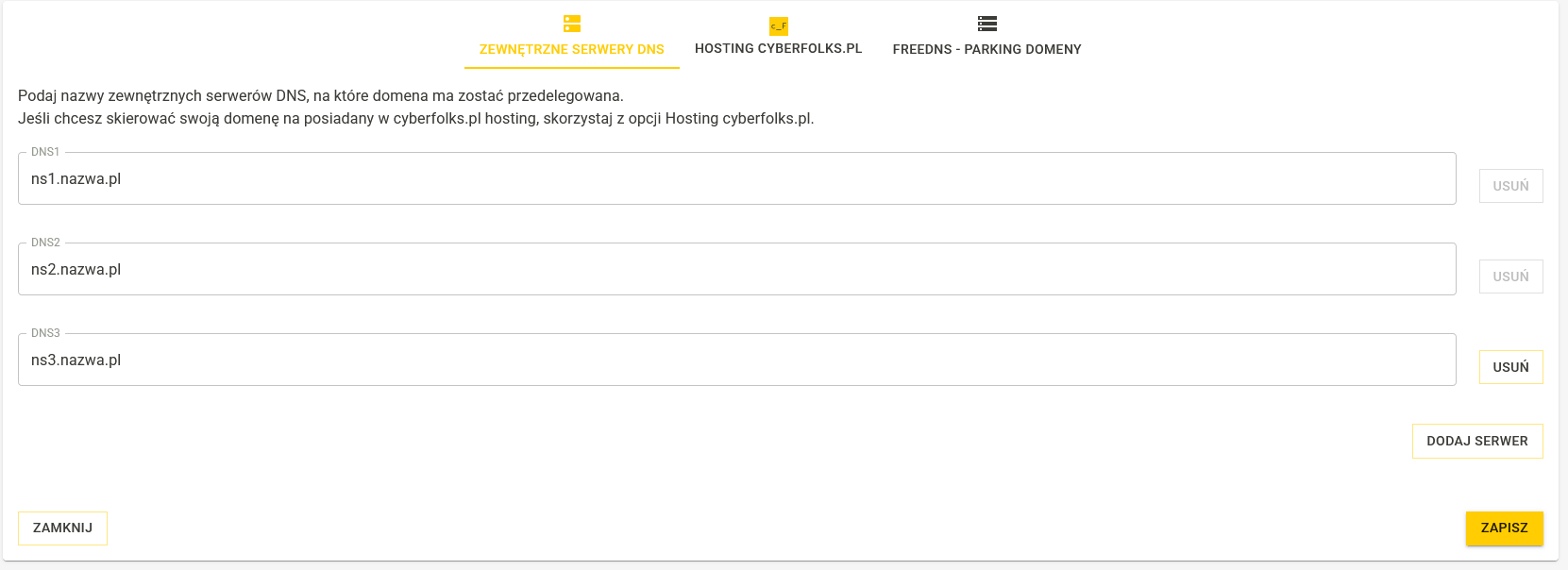 - Wprowadź serwery DNS nazwa.pl: ns1.nazwa.pl, ns2.nazwa.pl i ns3.nazwa.pl.