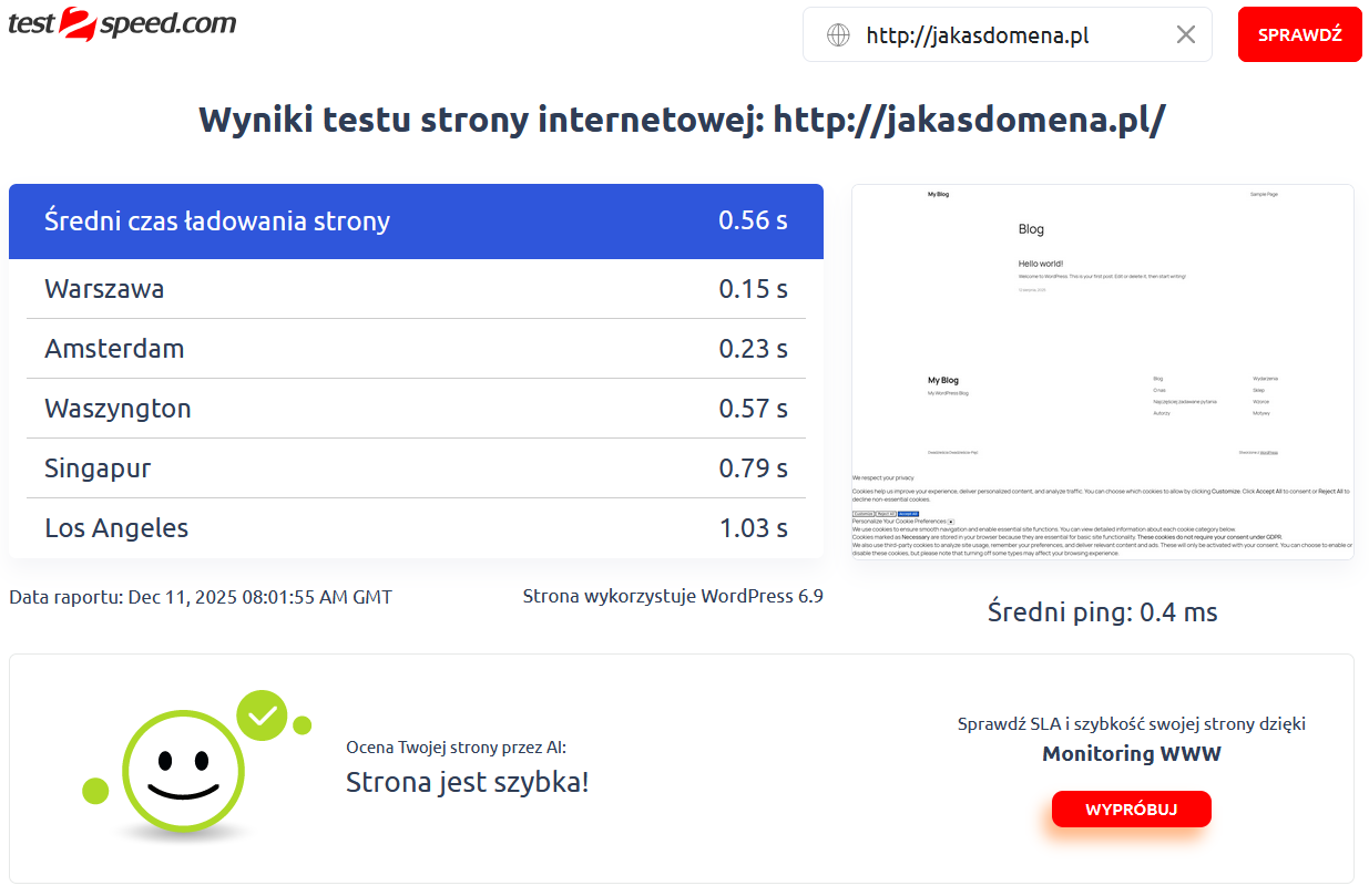 Po wykonaniu testu wyświetlona zostanie strona zawierająca jego pełny wynik. W pierwszej sekcji zobaczysz podgląd testowanej strony, średni czas ładowania strony z różnych lokalizacji na świecie, a także ocenę szybkości Twojej strony przez AI.