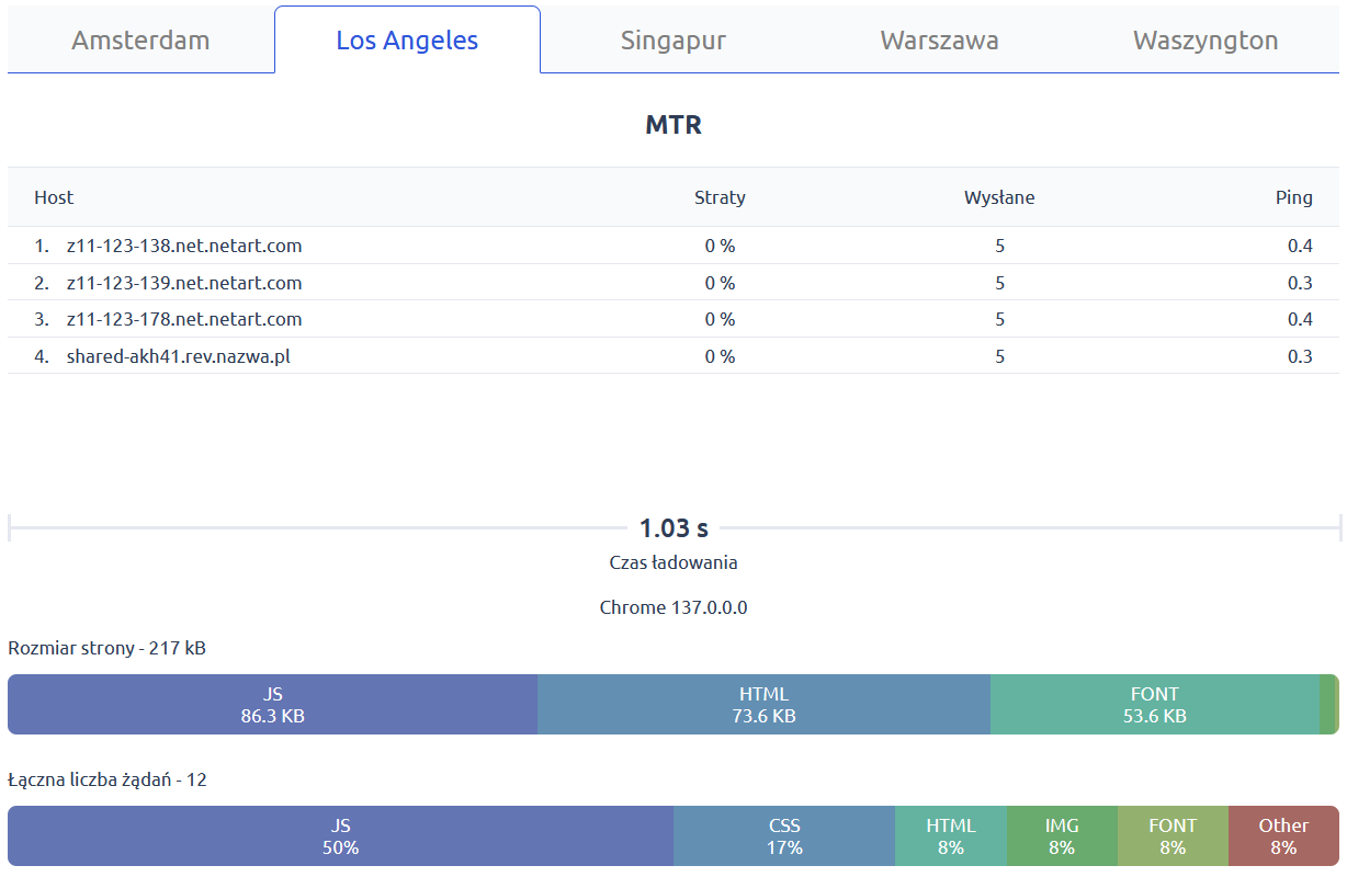 W kolejnej sekcji sprawdzisz wynik testu traceroute i ping do Twojej strony z wybranych lokalizacji na świecie, a także średni czas ładowania strony oraz rozmiar i liczbę żądań wyświetlenia poszczególnego rodzaju plików strony.