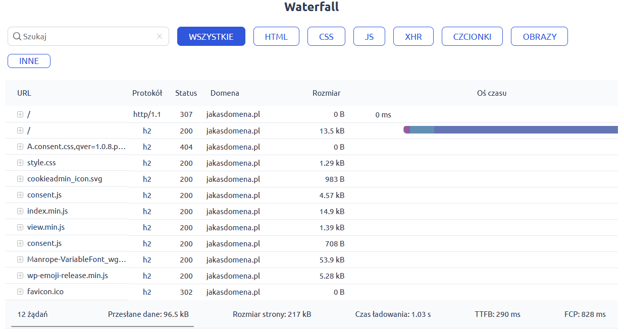 W ostatniej sekcji wyników sprawdzisz kaskadowy wykres czasu ładowania poszczególnych istotnych elementów Twojej strony.