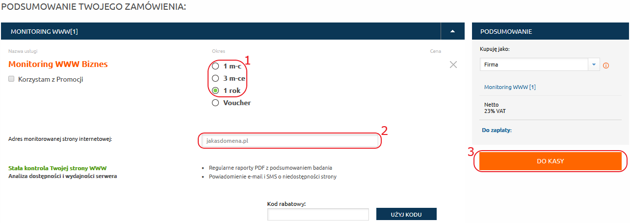 Wybierz okres abonamentowy (1) usługi. Poniżej wpisz adres strony internetowej, która będzie monitorowana (2). Po uzupełnieniu zamówienia, kliknij DO KASY (3).