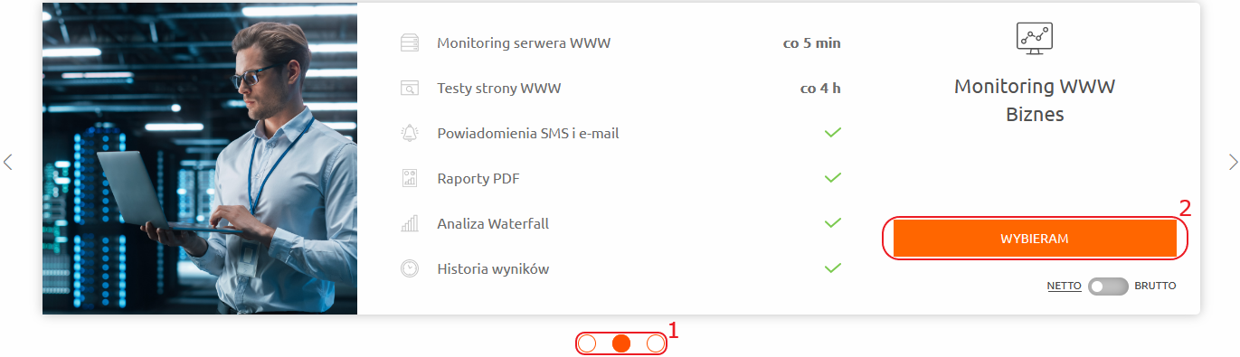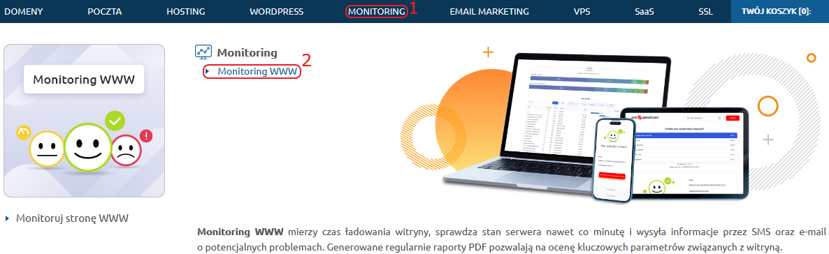 Aby zamówić usługę wejdź na stronę https://www.nazwa.pl, z górnego menu wybierz zakładkę MONITORING (1), a następnie kliknij odnośnik Monitoring WWW (2).